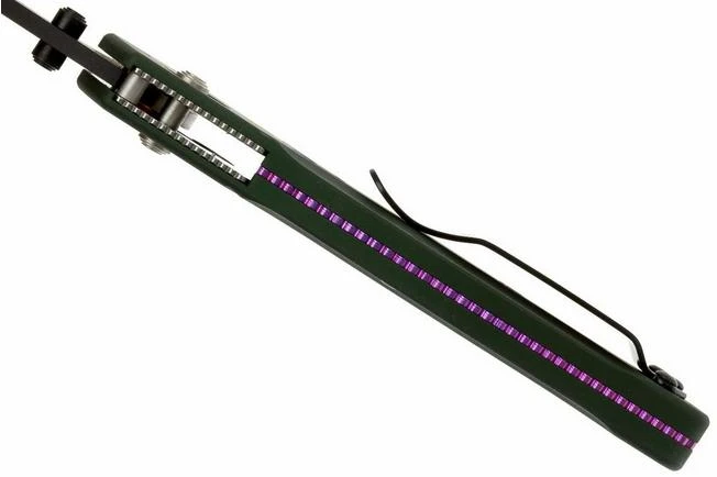 Osborne Design (Warren Osborne) is a designer of knives who makes a lot of designs for Benchmade. The 940 Osborne is a beautiful slim design. A lot of attention was paid to the look. The rippled titanium spacer between the parts of the handle is pink anodised. This provides a subtle contrast with the green aluminium handle. The handle feels a bit more rough than usual for aluminium. That is good news for the grip this knife offers. Also the shape of the blade is particularly attractive with a tanto-like shaped tip.