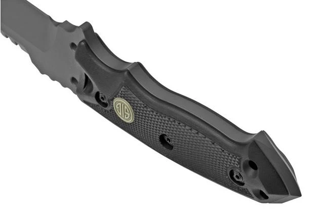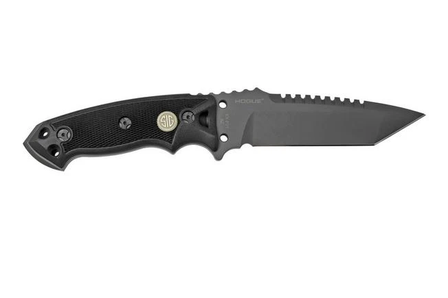 The Hogue EX-F01 Sig Sauer Tanto is a robust fixed knife. The blade is made from A2 tool steel. A type of steel that is only partially corrosion resistant. Fortunately the KG 2400 GUN-KOTE coating protects the knife from rust. The edge, however, does need a bit of TLC once in a while. Fortunately, this is more than compensated for by the toughness of this type of steel. As such it is a popular type of steel or combat knives.