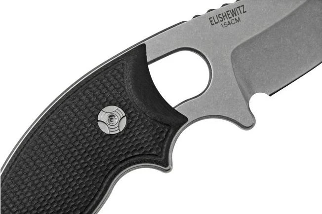 The Hogue EX-F03 is a lightweight neck knife, designed by knife maker Allen Elishewitz. The blade is made from 154CM steel and enhanced with a stonewashed finish. The end of the handle is enhanced with a lanyard eye with a piece of knotted rope. Because of the large cut-out in the handle the weight is low, great for a neck knife. It also enables you to wrap paracord around the handle. For a neck knife this knife is quite large. Where you sometimes see that the handle of a neck knife is difficult to handle with large hands, this handle offers enough grip. The blade, with its 5.5 cm cutting surface, is also comfortable to use.