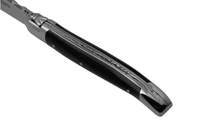 This Laguiole en Aubrac 12 cm pocket knife is a classic Laguiole knife. The handle is made from horn. The spine of the handle is decorated with stunning filework. The blade is made from stainless Sandvik 12C27MOD steel. Both the bolsters and the blade are polished. This makes the knife look extra chic.