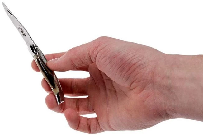 This Laguiole en Aubrac 7 cm pocket knife is a classic Laguiole knife. The handle is made from horn. The spine of the handle is decorated with stunning filework. The blade is made from stainless Sandvik 12C27 steel. Both the bolsters and the blade are polished.
