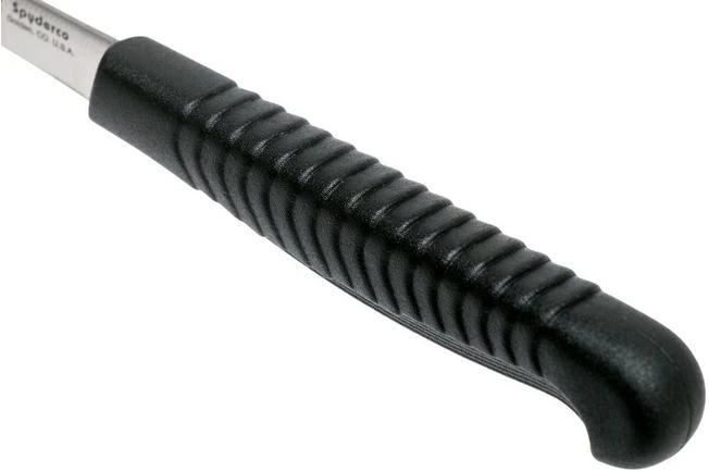 This small Spyderco turning knife K09PBK with curved edge will help you with all peeling and small cutting jobs in the kitchen. The thin blade makes this knife perfect for detailed tasks such as cutting thin slices or to peel potatoes, for instance. Thanks to the curved tip you can perfectly shape round products.