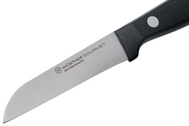 This Wüsthof Gourmet peeling knife is a small but versatile knife with a thin blade and smooth edge. This vegetable knife is made to cut onions and herbs, but is also great when chopping, cleaning and decorating fruit and vegetables. The difference with the other 8 cm peeling knife from the Gourmet collection can be found in the tip. While the other peeling knife is enhanced with a pointed tip, this peeling knife has